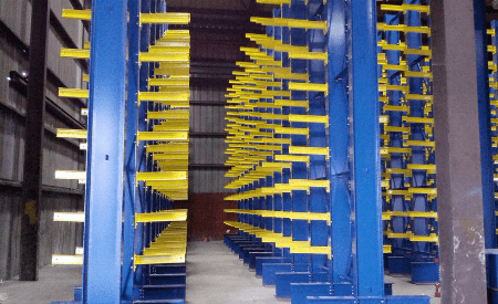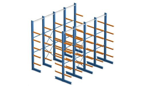Cantilever rack systems can be single, double-sided, or both, and consists of a large vertical column with horizontal arms and bases that project out from it in either direction, with the arms providing the support that the product sits on.